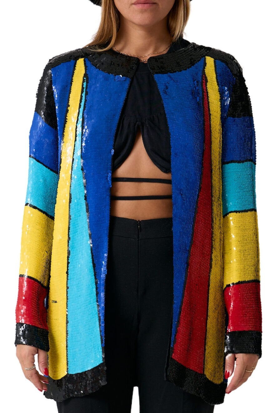 Den smukkeste bluse med pailletter og 100% silke <3 Denne Nagpal bluser er udsmykket med pailletter i flotte farver i et geometrisk mønster. Jakken kan lukkes ved kraven og falder ellers med vidde.